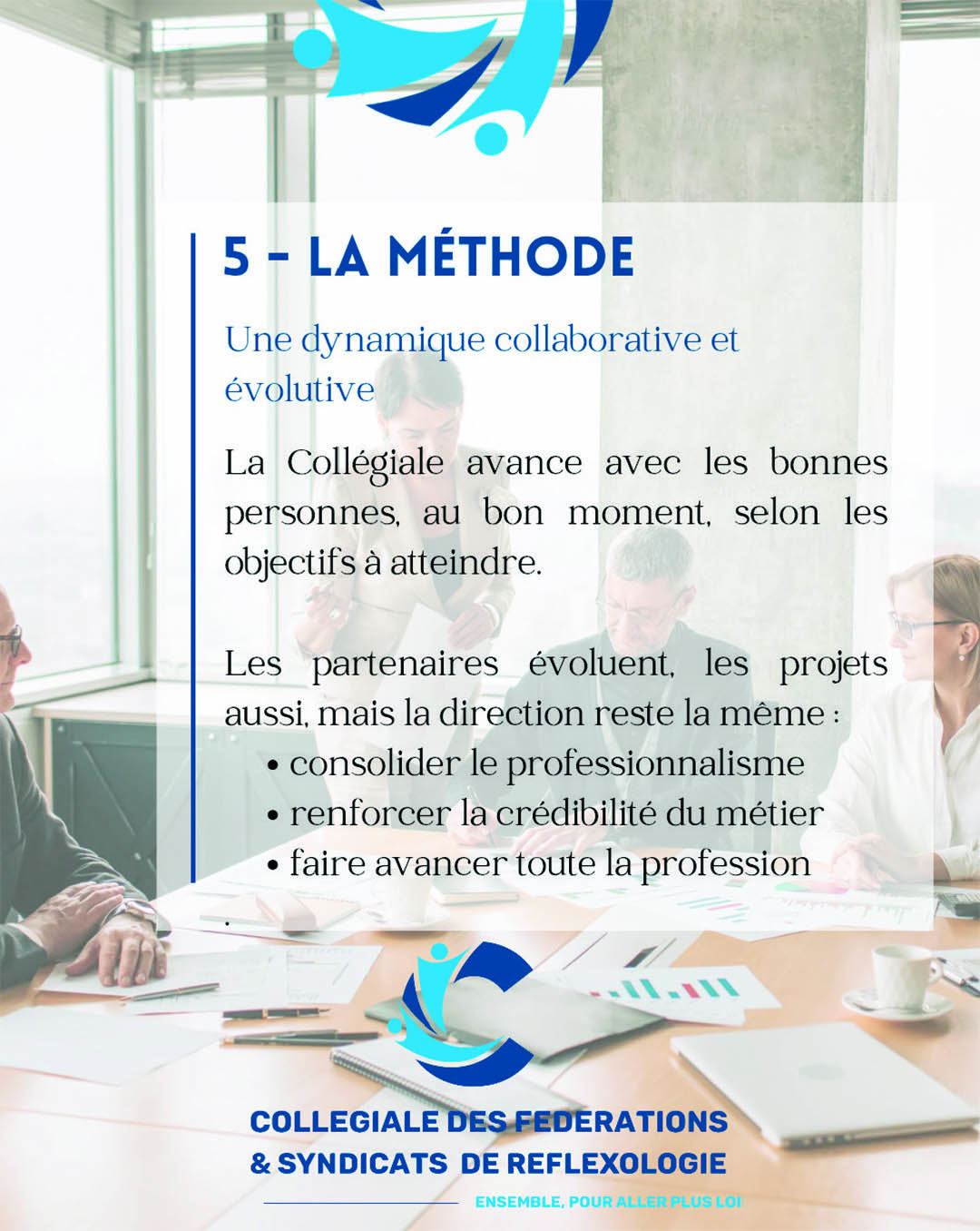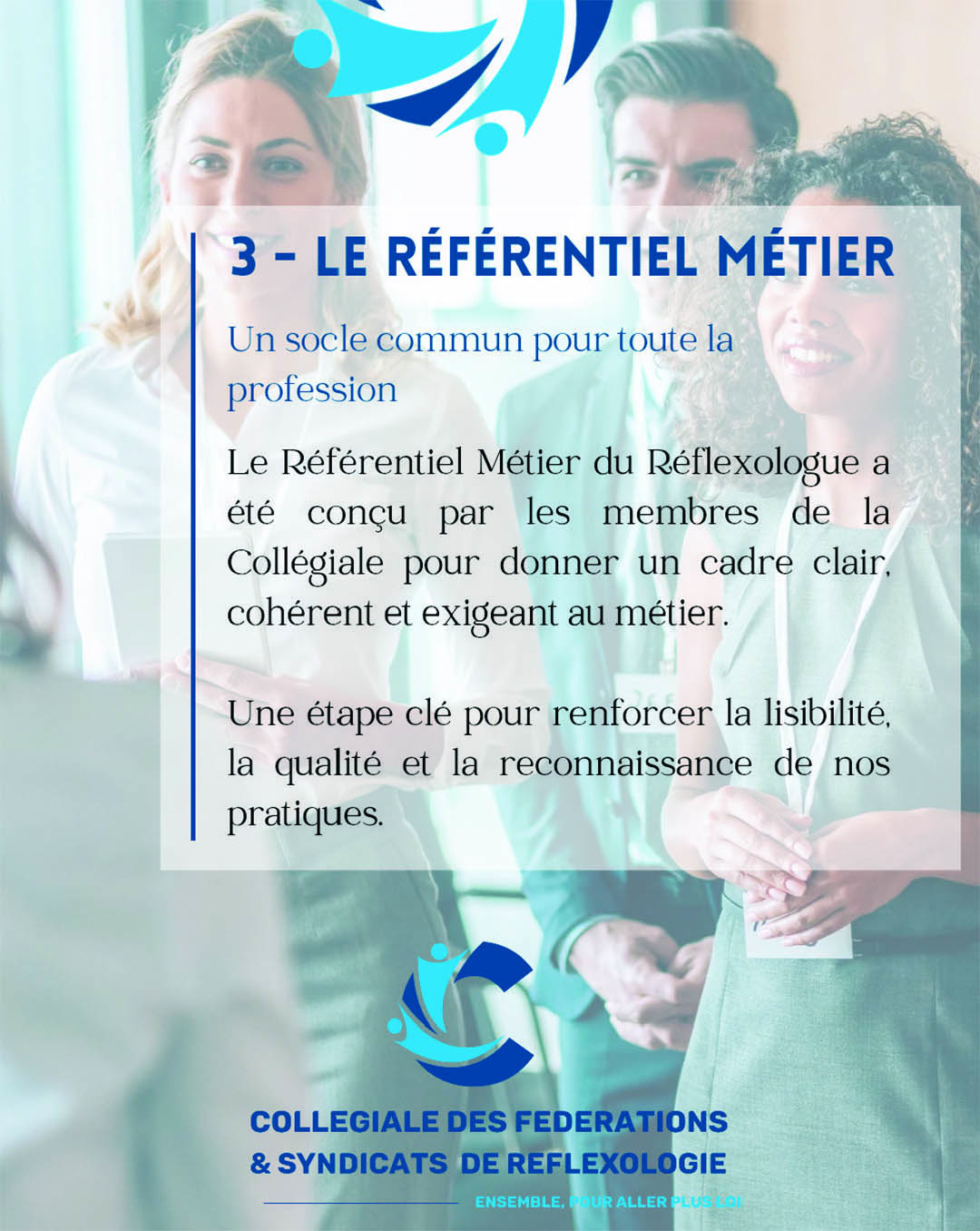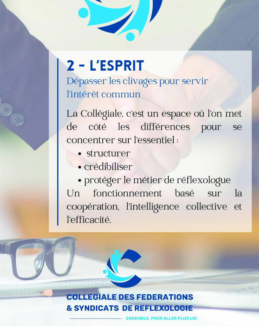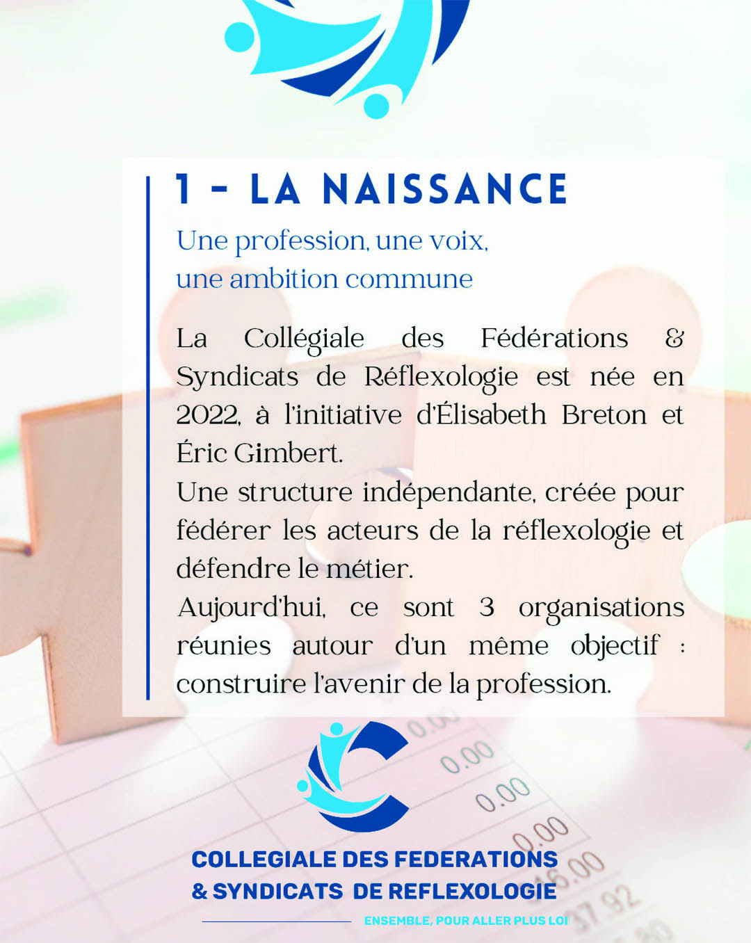 La Collégiale des Fédérations et Syndicats de Réflexologie est née en 2022, à l’initiative individuelle d’Elisabeth Breton et Éric Gimbert, dans un contexte où la profession de réflexologue ressentait plus que jamais le besoin de se structurer, de s’unir et de parler d’une seule voix, sans voir son action freiner par des intérêts particuliers. Cette volonté d’œuvrer avec celles et ceux qui souhaitent faire « avancer » notre métier s’est avérée payante. Certains ont agi momentanément, d’autres continuent à le faire avec enthousiasme, pendant que d’autres encore ont rejoint ce collectif.