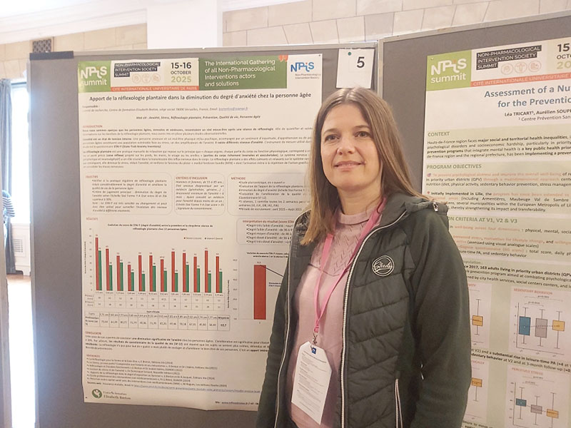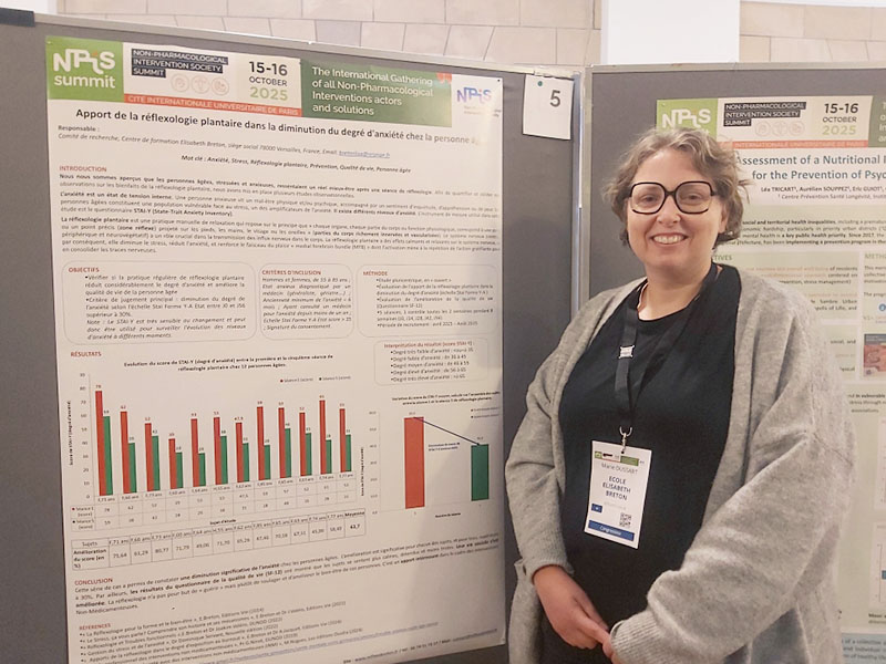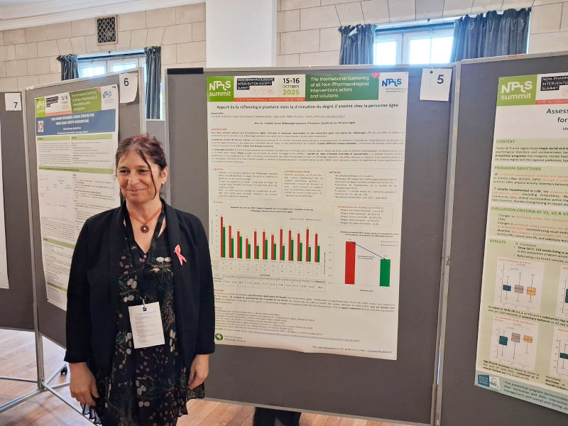 Comme en 2024, Elisabeth Breton a eu le plaisir de présenter un Poster consacré à la Réflexologie. Le thème de cette année était : « Apport de la réflexologie plantaire dans la diminution du degré d’anxiété chez la personne âgée« .
