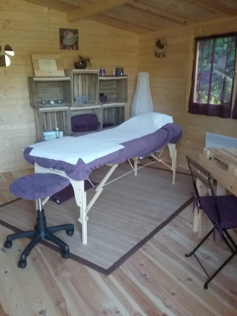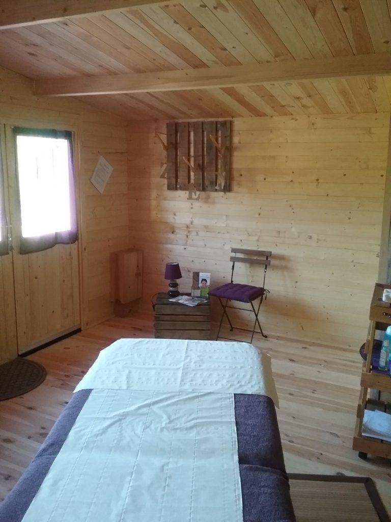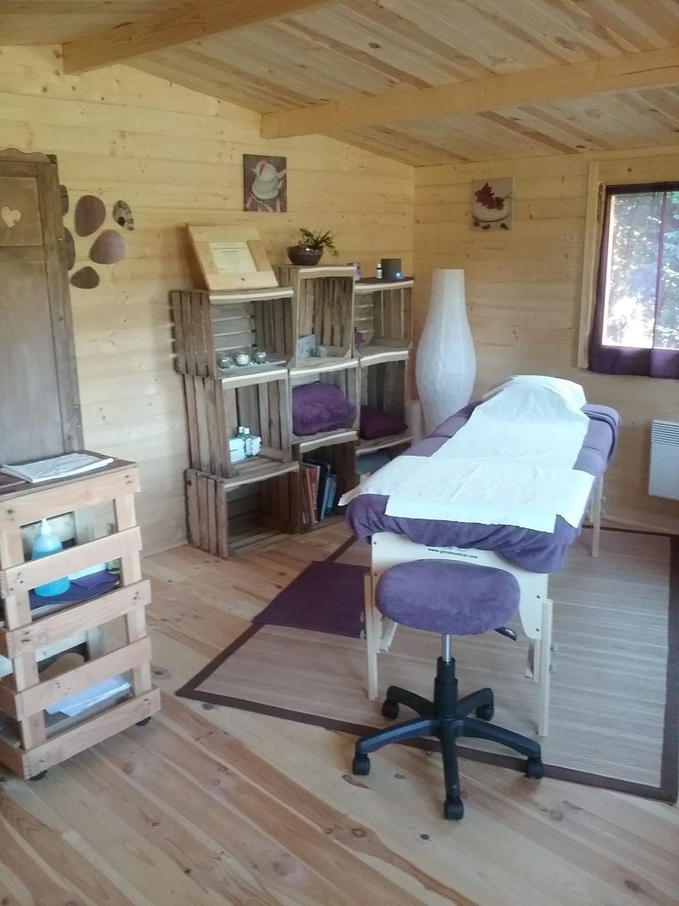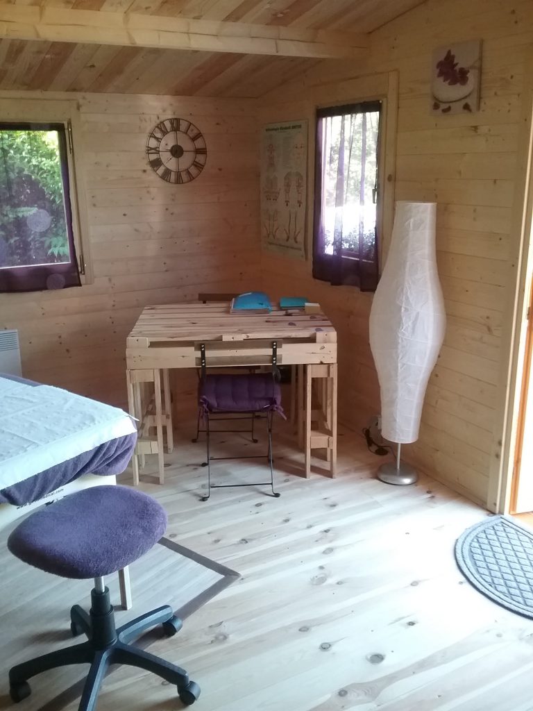 J’exerce dans mon cabinet à la campagne dans un chalet tout en bois aménagé de façon très cocooning pour passer un agréable moment de détente.